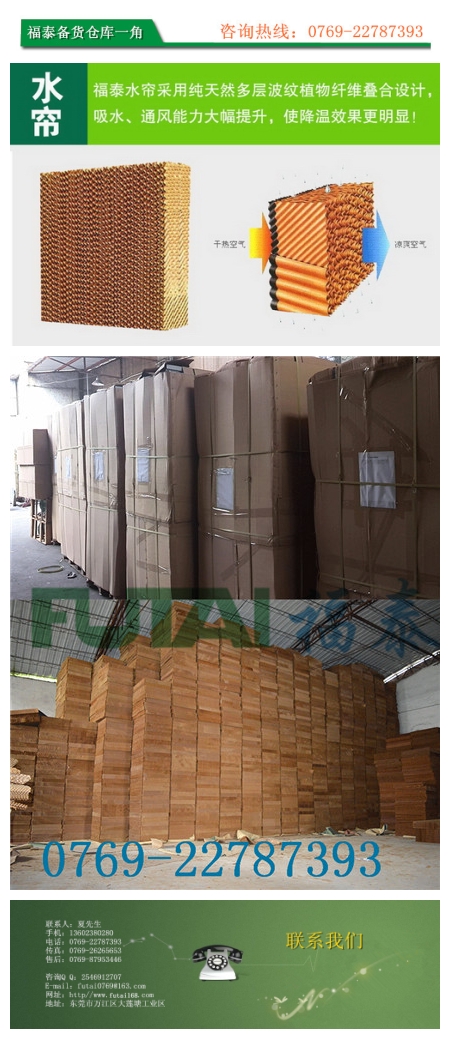 濕簾型號(hào)常規(guī)分為:5090 6090 7090 前面兩種是環(huán)保空調(diào)專(zhuān)用。而7090是濕簾墻專(zhuān)用的。厚度一 般為10公分15公分厚。也可以訂做更厚的。這兩種是常用規(guī)格了。濕簾紙如何更換|濕簾片降溫系統(tǒng)的降溫過(guò)程是在其核心——濕簾紙內(nèi)完成的;當(dāng)室外的干熱空氣被風(fēng)機(jī)抽吸穿過(guò)濕簾紙時(shí),水膜中的水會(huì)吸收空氣中的熱量后蒸發(fā),帶走大量潛熱,使經(jīng)過(guò)濕簾紙的空氣溫度降低,經(jīng)過(guò)這樣處理后的涼爽空氣進(jìn)入室內(nèi)。同時(shí)在冷卻過(guò)程中,清除室外空氣中之粉塵廢氣、增加進(jìn)氣含氧量,使室內(nèi)空氣更為清新,品質(zhì)更佳;利用風(fēng)機(jī)+濕簾的負(fù)壓通風(fēng)原理,將室內(nèi)的廢氣、污氣排出,徹底解決高溫悶熱環(huán)境,可使室內(nèi)溫度(3245的高溫環(huán)境)迅速地在10分鐘內(nèi)下降,并將溫度保持在2630;不含易使皮膚過(guò)敏的苯酚等化學(xué)物質(zhì),安裝使用時(shí)對(duì)人體無(wú)毒無(wú)害,綠色、安全、節(jié)能、環(huán)保、經(jīng)濟(jì)適用。