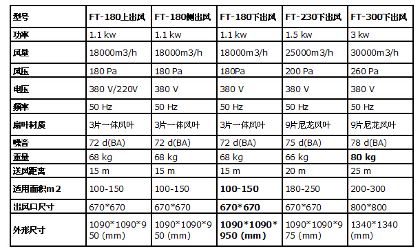 FT-300環(huán)保空調(diào):風(fēng)量為30000平方米,電機(jī)功率為3kw,送風(fēng)距離為30-50米左右,適用的面積在FT-250環(huán)?照{(diào):風(fēng)量為25000平方米,降溫覆蓋面積在200-250平方米,每個(gè)小時(shí)的蒸發(fā)量為112L/h,儲(chǔ)水量65L。