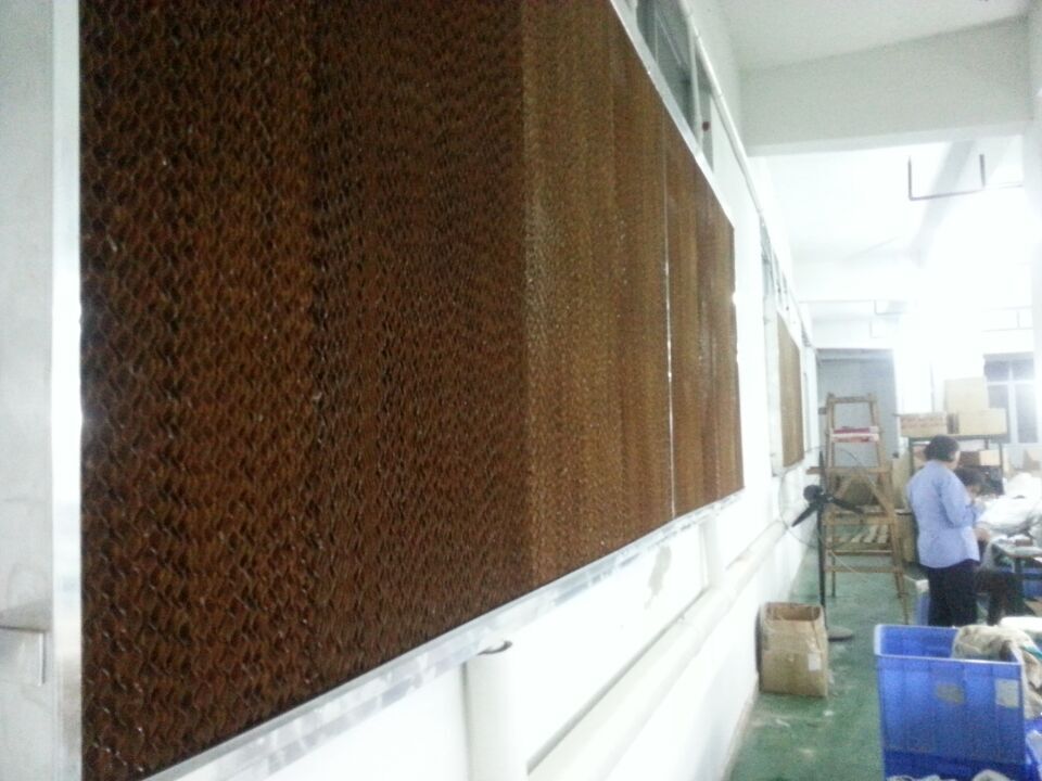 此方案的降溫原理是通過抽風(fēng)機(jī)將室內(nèi)的高溫悶熱空氣抽出,另一邊室外的熱空氣通過水簾降溫后補(bǔ)充到車間內(nèi),但由于他的濕度太大,而且易臟易壞又不方便維護(hù)保養(yǎng),所以并不建議客戶安裝使用,當(dāng)然了如果車間內(nèi)不怕濕度同時(shí)又想節(jié)省成本的話,這種降溫方案還是非常適用的,但要注意的是由于水簾是由多層波紋纖維疊合物(水簾紙)易損壞,所以在設(shè)計(jì)安裝的時(shí)候最好加上一層保護(hù)隔離網(wǎng)在外面,這樣就能保證它的使用壽命更長(zhǎng)。
