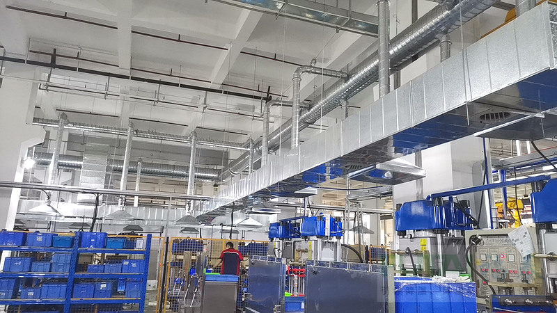 方案二,廠房內(nèi)生產(chǎn)人員較少,設(shè)備少,預(yù)算緊張時,可考慮用崗位定點降溫。這時根據(jù)人員、設(shè)備分布的位置,用蒸花式水冷空調(diào)連接通風(fēng)管,把冷風(fēng)引至每個生產(chǎn)人員的位置,定點定位給員工降溫。在員工的頭頂有28度的冷風(fēng)一直吹,工人就不會有悶熱的體驗這種方案投入少,運行成本低,但只是有人的位置涼快,沒有人的位置不好意思,它就是會熱。