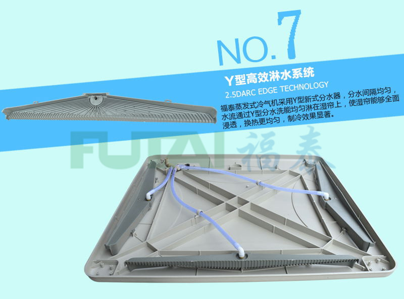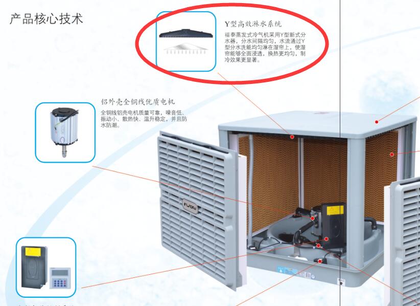 Y型敞開式分水盤布水系統(tǒng),淋水均勻暢順使節(jié)能環(huán)?照{(diào)機(jī)內(nèi)水泵不間斷地抽取水槽內(nèi)的凈水,通過分水器均勻地送至濕簾上。當(dāng)室外空氣被強(qiáng)力風(fēng)扇吸引經(jīng)過蒸發(fā)換熱器時(shí),空氣中的水溶性異味、粉塵雜物均被水流過濾沖刷到了水槽,高速通過濕簾的氣流強(qiáng)迫水迅速蒸發(fā),從而吸收周圍大量的熱能,令氣流溫度極速下降,輸出強(qiáng)勁的低溫清新氣流。低溫潔凈的冷氣流由風(fēng)機(jī)高壓渦盤加壓后通過管道送入室內(nèi)。由于冷氣流的密度較熱氣大,故冷氣流與熱氣相遇后,迅速下沉,擠占熱氣原來的位置,熱氣被抬升到離地面3-5米的高度,而不斷進(jìn)入的低溫冷氣流始終占據(jù)著空間內(nèi)較低的高度,使該區(qū)域保持舒適宜人的溫度、濕度和鮮風(fēng)。